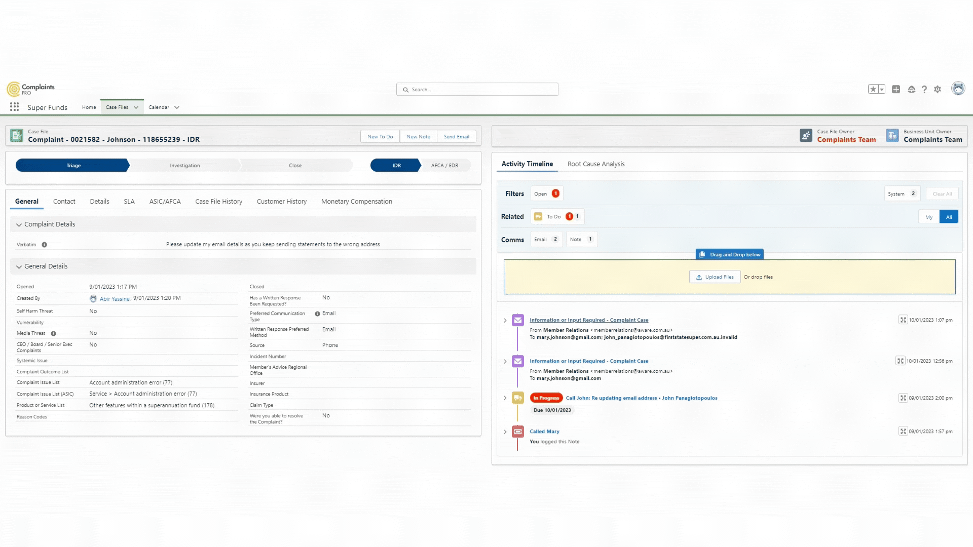 Self-guided wizards make it easy to capture lodged as open and closed on first contact complaints, whilst ensuring all data required for compliance is collected. Also, with clever features like being able to drag and drop emails from outlook directly into a case file, gather evidence with ease.